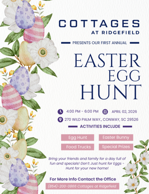 Join the Cottages at Ridgefield for their first Easter Egg hunt! Enjoy food trucks, the egg hunt, special prizes, and an easter bunny! Bring your friends and family for a day full of fun and specials! Don't just hunt for eggs, hunt for your new home!